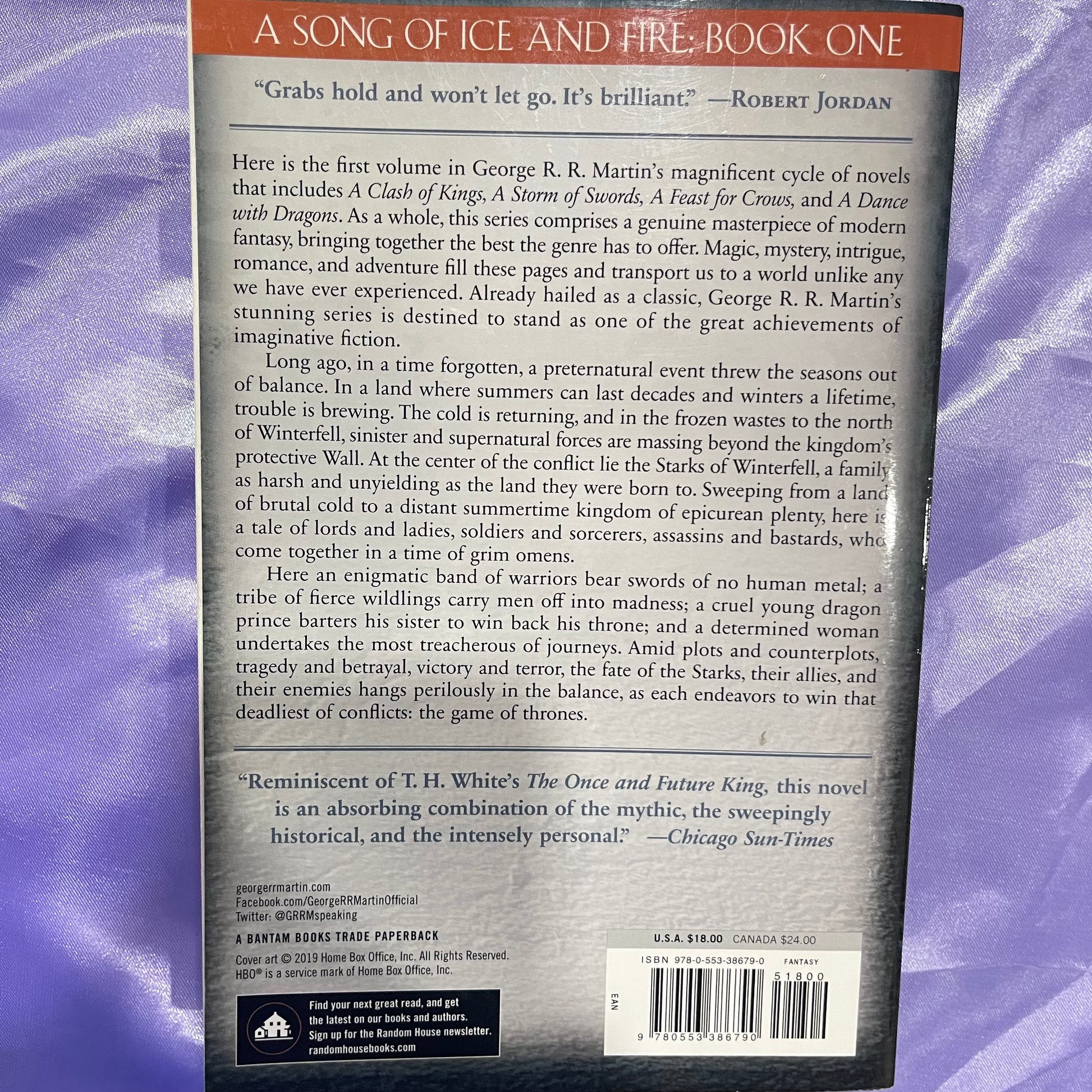 In a land where summers can last decades and winters a lifetime, trouble is brewing. The cold is returning, and in the frozen wastes to the North of Winterfell, sinister and supernatural forces are massing beyond the kingdom’s protective Wall. At the center of the conflict lie the Starks of Winterfell, a family as harsh and unyielding as the land they were born to. Sweeping from a land of brutal cold to a distant summertime kingdom of epicurean plenty, here is a tale of lords and ladies, soldiers and sorcerers, assassins and bastards, who come together in a time of grim omens. Amid plots and counterplots, tragedy and betrayal, victory and terror, the fate of the Starks, their allies, and their enemies hangs perilously in the balance, as each endeavors to win that deadliest of conflicts: the game of thrones.